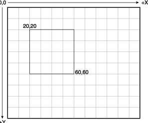 Das Koordinatensystem von Java hat seinen Ursprungspunkt (0,0) in der oberen linken Ecke. Positive X-Werte verlaufen nach rechts und positive Y-Werte nach unten. Alle Pixelwerte sind ganze Zahlen (Integer). Es gibt keine Pixelteilwerte oder Brüche. Abb. 9.1 zeigt, wie Sie in diesem Koordinatensystem ein einfaches Quadrat zeichnen.