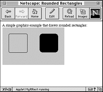 Die folgende paint()-Methode innerhalb der Klasse MyRect zeichnet zwei abgerundete Rechtecke: Eines mit Umrißlinie und abgerundeten Ecken von 10 Pixel Breite und Höhe und ein gefülltes mit abgerundeten Ecken von 20 Pixel Breite und Höhe (Abb. 9.5 zeigt die sich daraus ergebenden Formen):