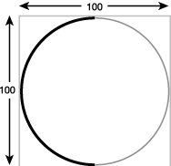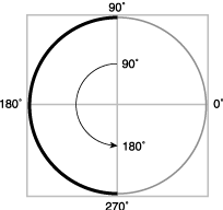 Die letzten beiden Argumente erhalten Sie, wenn Sie sich den Kreis in einer Gradteilung entgegen dem Uhrzeigersinn vorstellen. Null Grad liegt bei 3 Uhr, 90 Grad bei 12 Uhr, 180 Grad bei 9 Uhr und 270 Grad bei 6 Uhr. Der Anfangspunkt des Bogens liegt oben bei 90 Grad; also ist 90 das fünfte Argument.