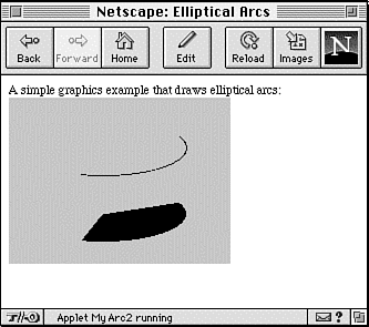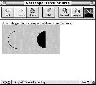 Die Methode drawArc() verfügt über sechs Argumente: die Ausgangsecke, die Breite und Höhe, der Startwinkel des Bogens und den Winkel, der beim Zeichnen überstrichen werden soll. Auch hier zeichnet die Methode drawArc() den Umriß des Bogens und fillArc() einen gefüllten Bogen. Gefüllte Bögen werden als Abschnitte eines Kreises gezeichnet. Die beiden Endpunkte werden hierbei in der Kreismitte zusammengefügt.