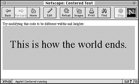 A Die Möglichkeiten, mit Java Text anzuzeigen, sind relativ primitiv. Java hat kein Konzept für den aktuellen Punkt, deshalb müssen Sie selbst herausfinden, wo das Ende der ersten Zeichenkette liegt, um bestimmen zu können, wo die nächste beginnt. Mit der Methode stringWidth() können Sie sowohl die Breite einer soeben gezeichneten Zeichenkette ermitteln und zusätzlichen Raum danach einfügen.