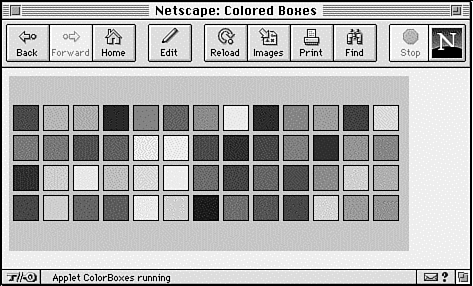 Kern dieses Beispiels sind die zwei for-Schlaufen. Die erste zeichnet die Zeilen und die zweite gibt die einzelnen Kästchen in den Zeilen aus. Beim Zeichnen eines Kästchens wird zuerst die Zufallsfarbe ermittelt, anschließend wird das Kästchen gezeichnet. Um jedes Kästchen wird eine schwarze Umrißlinie gezogen, damit diese nicht von der Hintergrundfarbe des Applet überblendet werden. Da diese paint()-Methode neue Farben erzeugt, sobald das Applet ausgeführt wird, können Sie die Farben regenerieren, indem Sie das Applet-Fenster verschieben oder durch ein anderes Fenster überlagern. Abb. 9.22 zeigt das endgültige Applet (obwohl der Schwarzweiß-Druck die Farbpalette natürlich nicht wiedergeben kann).